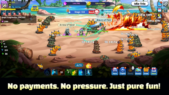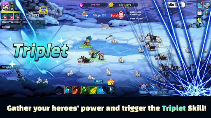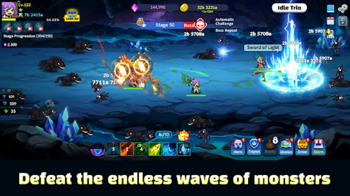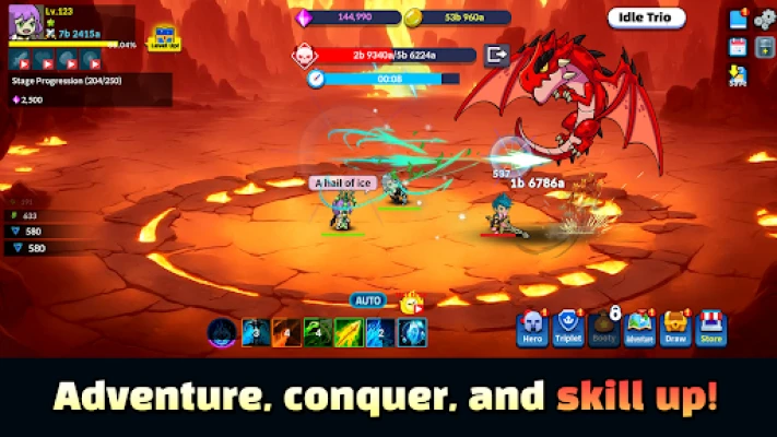 Kokoa kolmen sankarillisen hahmon joukkueesi ja valmistaudu kokemaan kolminkertainen voima. Idle Trio mahdollistaa näyttävien joukkotaitojen ja räiskyvien erikoisliikkeiden vapauttamisen, jotka jättävät vastustajasi sanattomiksi. Hirviölaumat hyökkäävät lakkaamatta, mutta se ei ole ongelma: pelisi etenee automaattisesti, keräten resursseja ja vahvistaen joukkuettasi jopa silloin, kun olet poissa. Nauti jatkuvasta edistyksestä ja katso, kuinka sankarisi kehittyvät voimakkaammiksi vaivattomasti.